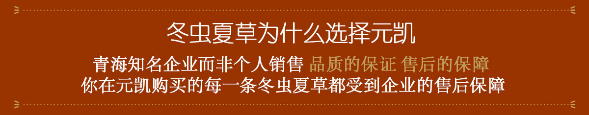 公司專業(yè)致力于青藏高原野生冬蟲夏草銷售、采收、精選包裝和現(xiàn)代化生產(chǎn)、研發(fā)等,并且在青海玉樹西藏那曲設(shè)立了采購站,專門采購地道的野生冬蟲夏草,充分保證了產(chǎn)品的品質(zhì)。元凱長期向國內(nèi)眾多著名藥材經(jīng)銷商、港澳臺以及東南亞中藥材采購商供應冬蟲夏草,多次被省、市、縣授予多種榮譽稱號“青海省知名商標”、“青海省誠信單位”、“青海省名優(yōu)企業(yè)”、“守合同重信用企業(yè)”等。